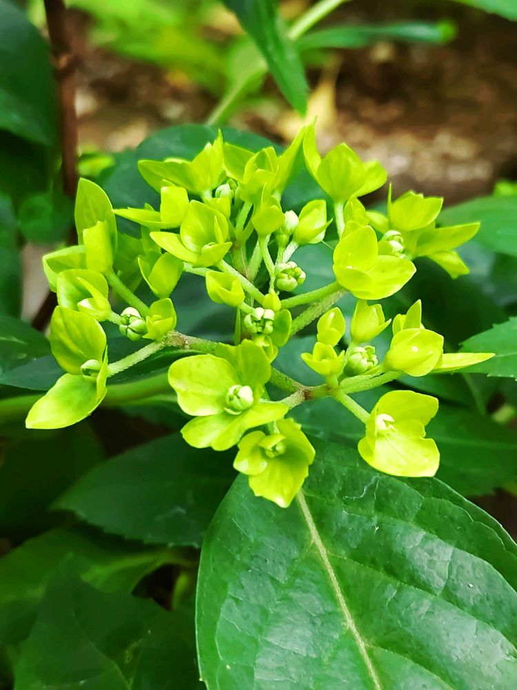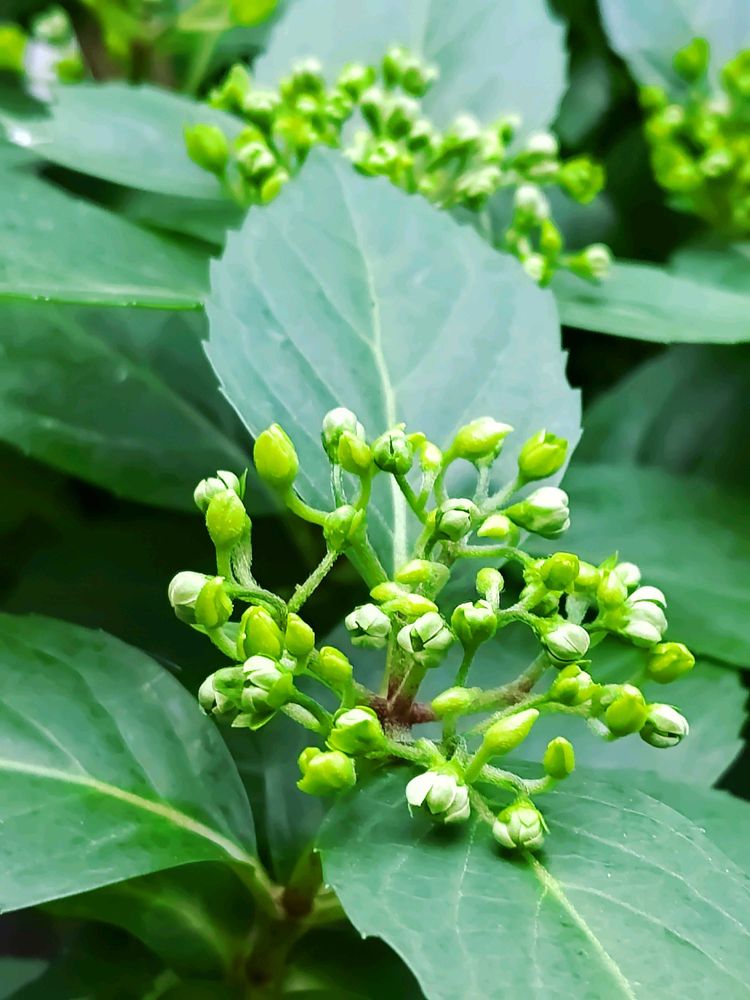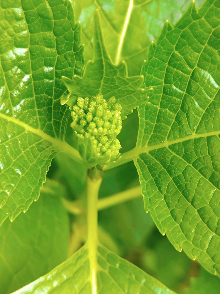 ③おたふく紫陽花の葉をこっそり開いてみるとぎゅっと花芽もついて…