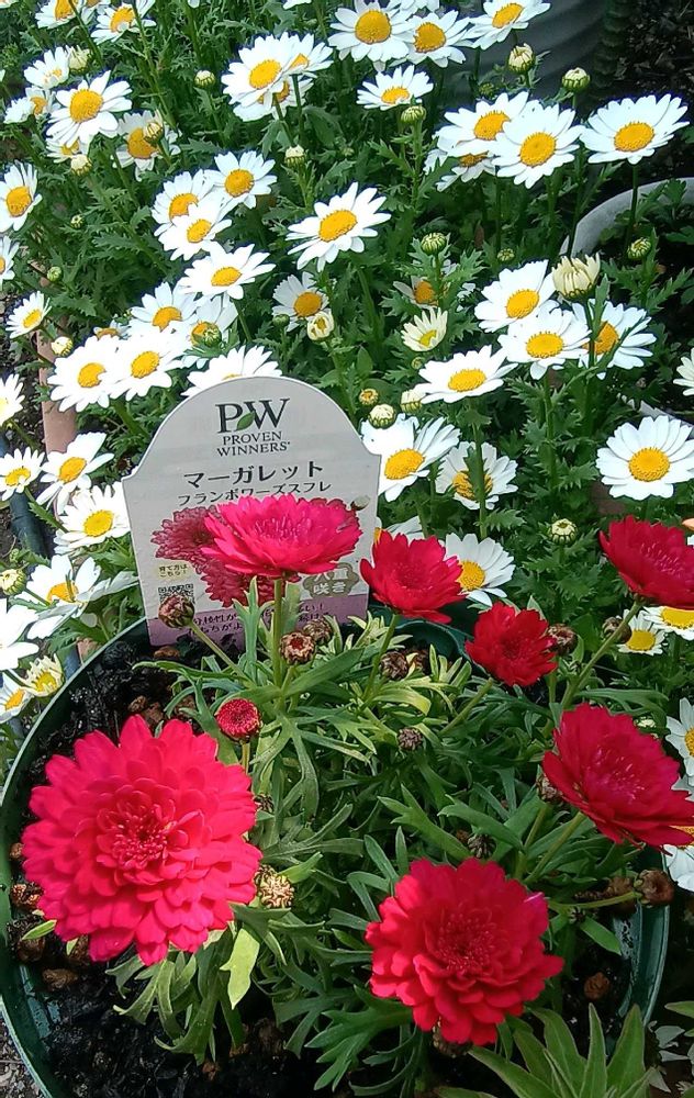 八重咲きマーガレットやバーベナ3色、カリブラコア2色、ペンステモンの苗などを連れ帰りました♫