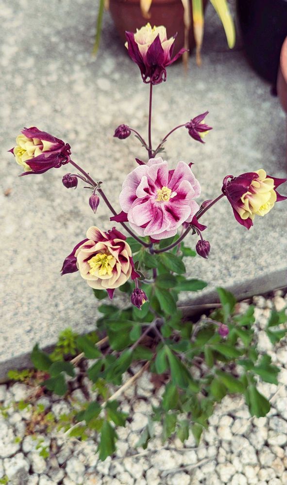 こぼれ種の八重のオダマキがあちこちと