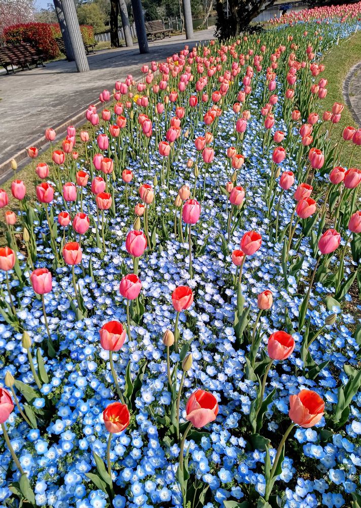 まわりにネモフィラ🩵中央にチューリップ🌷とっても可愛いです💕