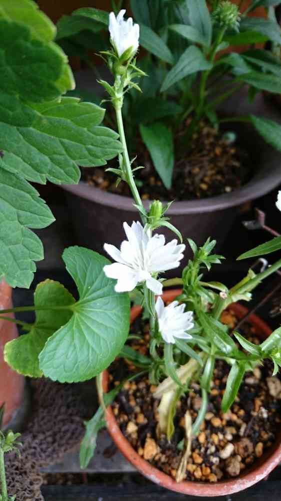 一昨日いつもの 庭の花さんへいったら チコリ 白花もあるんだよ! 一鉢しかないけど… いる?と言うので もちろんブンブンうなずいて頂いて参りました💛