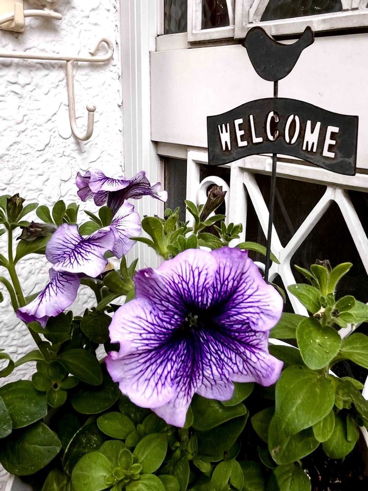 ③濃い紫の花色が小さな古家🏠の白い壁面やドアに映えてます☺️