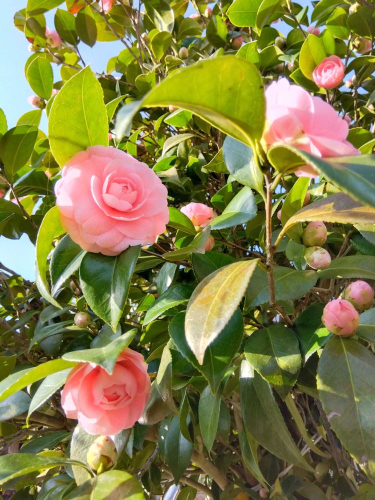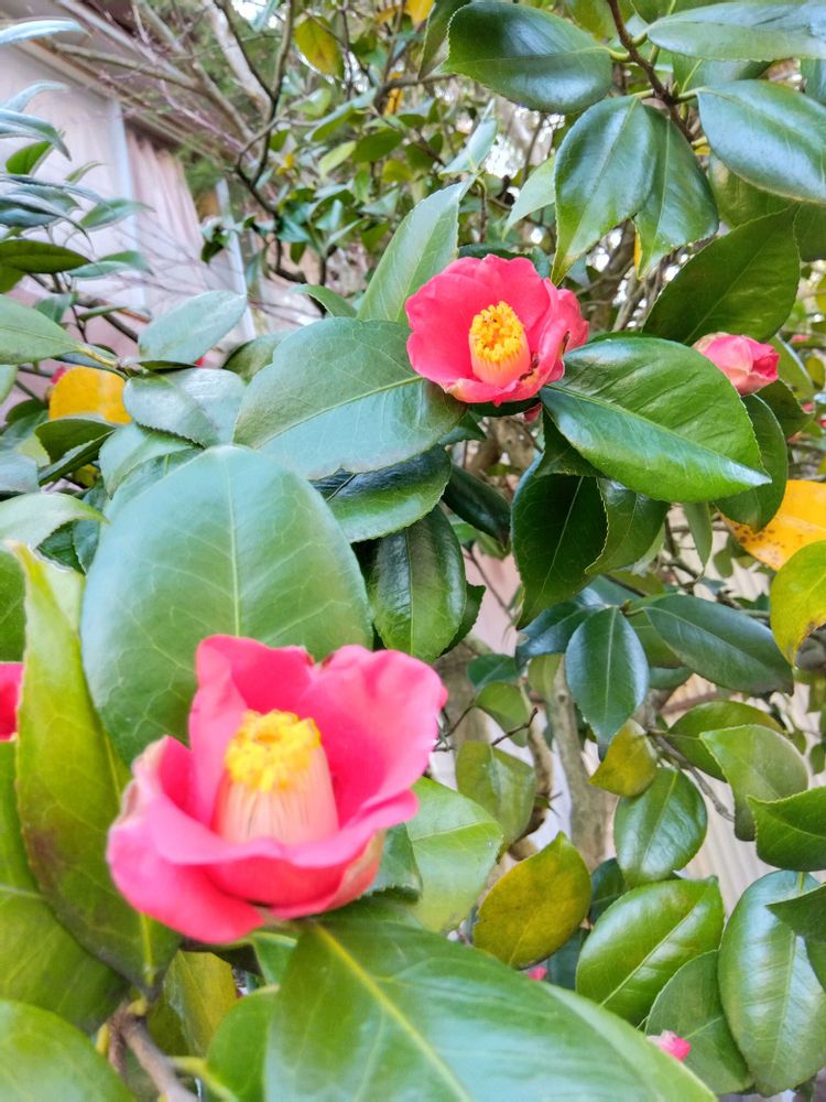 ようやく雨が上がり、庭のツバキが咲きだしました🤗