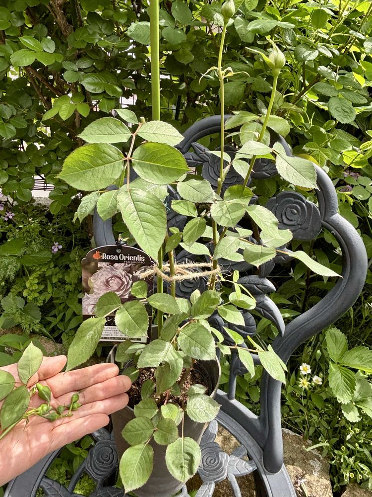 ③一昨日届いた新苗🌹ザ・セレスティアル❣️蕾が10個も付いていて😂泣々ピンチ💦気長に見守る👍