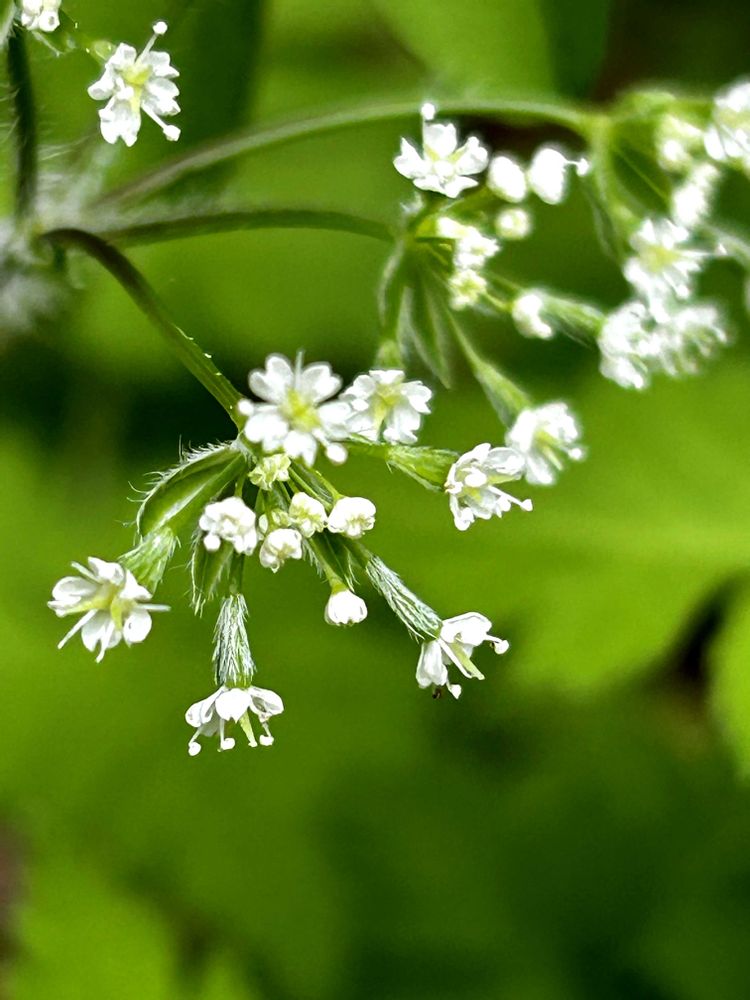 枝から複散形花序を出し、小さな白い花をまばらにつける