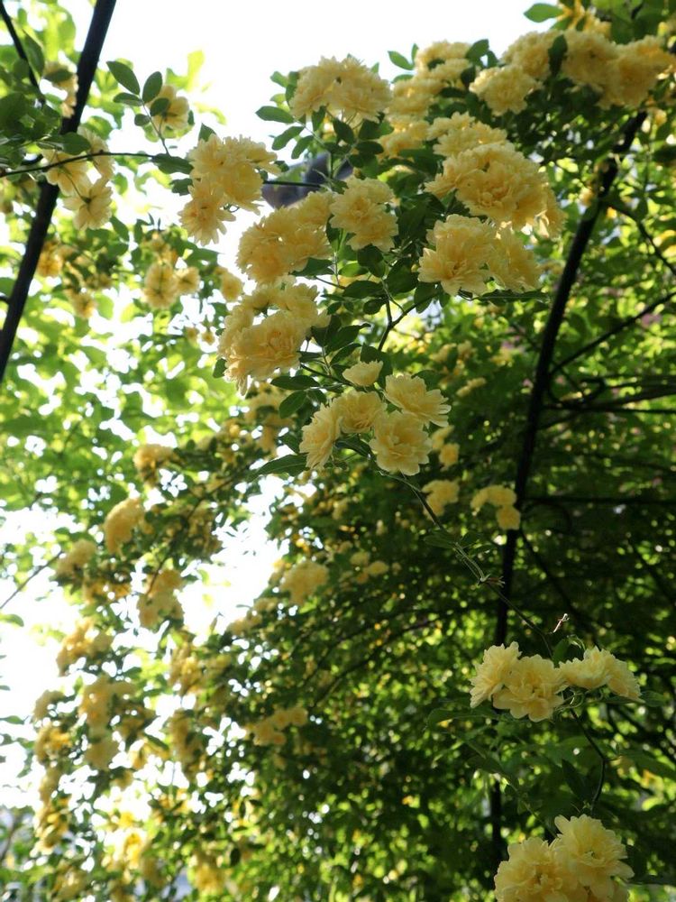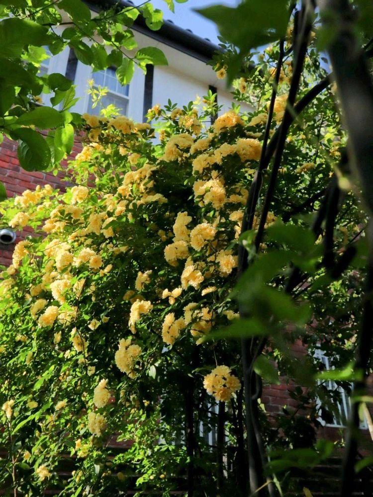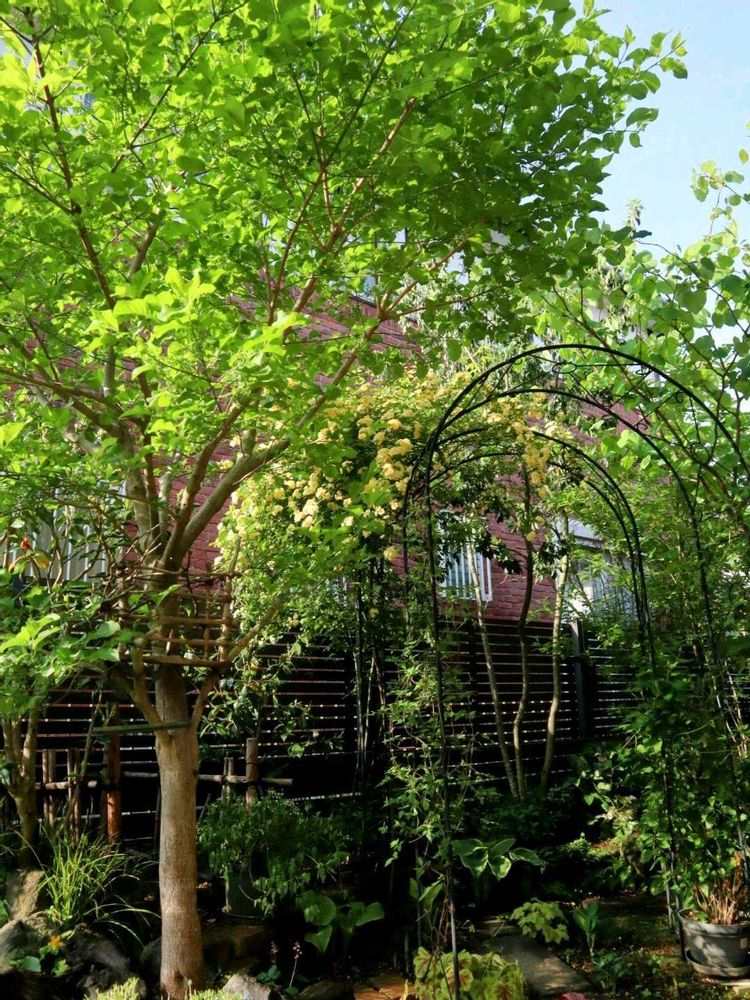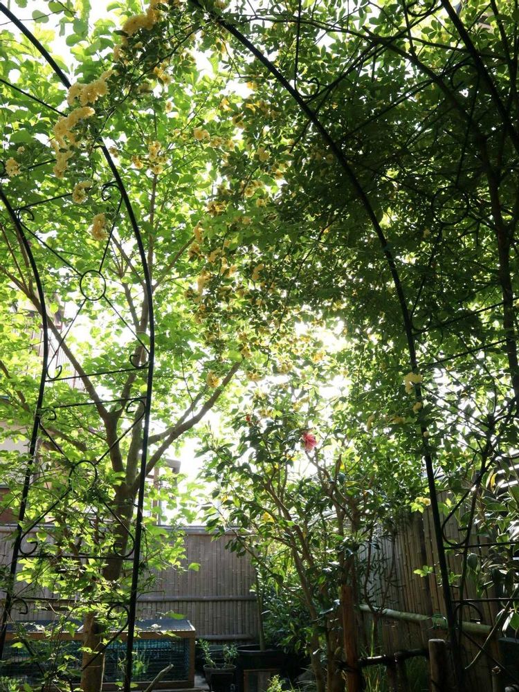 モッコウバラが満開になりました!昨年バッサリ剪定したのにやはりモサモサ(笑) しかも手前のマユミの木が大きくなってモッコウバラがよく見えない(笑) 来年に向けての課題は、手前のアーチの上に被せて、奥はスッキリにすればアーチ下も明るくて綺麗に見えるかなと思いました!楽しませていただいたので、週末は花弁が散る前に剪定します♪アーチ下ではクレマチスや山野草が太陽を欲してますし(笑)