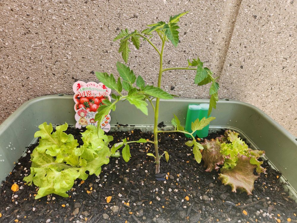 ちょっと大きめのプランターにミニトマトとサニーレタスを一緒に植えたけどうまく育つと良いなぁ~(笑)