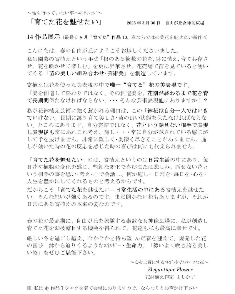 GSユーザー(素人)から寄せ植え 作家になった伝説のアーティストを応援しよう‼️フォロー&リフォローでなく作品を評価して頂き、あと少しで2千フォローワーに🥹 全て独学探究⚜️(初投稿: 2021.6.20) website:https://flower-yoshikazu.jp GSに投稿したところ、ユーザーの皆様から高評価頂き「💐寄植えで幸せにしたい💞」 とFlowerArtistに。ユーザーの夢を広げるべく奮闘中✨ 🔶 今後は皆様に楽しんで頂けるよう GreenSnap「静止画 作品発表(作品集)」 Youtube「動画 作品一周鑑賞&イベント展示状況」 の2本立てでお届けします‼️ ぜひご登録下さい ↓ https://www.youtube.com/@flower_art_yoshi 皆様の応援こそ何よりのエネルギー 「両方フォローして応援してね~🤗🤗🤗💞」 ♦️ 活動歴「イベント作品展示等」🌸 🔸info:次回は11月自由が丘 2025年 ❁ 6/29:自由が丘ボタニカルマーケット.8 三井住友銀行広場作品展示‼️ ❁ 3/30:自由が丘ボタニカルマーケット.7 駅前ロータリー女神像前広場に「最長5ヶ月育てた作品等14作品展示‼️」 2024年 ❁ 12/14,15:自由ヶ丘ボタニカルマーケット.6 de aone 花のイベント会場を花鉢植えで演出 11作品展示‼️ ❁ 4/14,15:同上 9作品展示 2023年 ❁ 4/15,16:GreenSnapイベント出展「秋末から約半年“育てた”花鉢植え15作品展示‼️」始~終まで鑑賞者が絶えず大反響を得る✨ (横浜山下公園) 2022年 ❁ 4/17,18:Green Snapイベント出展 ~同上~ 等 インスタ 「自由が丘ボタニカルマーケット」 https://Instagram.com/jiyugaoka_botanical_market ・「アトリエ·ガーデン全自作」「ナゼろうそくの火は下記」「アーティストとしての考え方は 2022.1.29投稿に記載」 ♦YouTube開設 GSは動画投稿できないので「花好きなユーザーの為に 美花と美曲で優しい気持ちになってほしい」と開設‼️ 「美しい💐寄植えを見ながらクラシック名曲を聴ける」花好きには最高の夢世界を提供✨ ※ 当時まだ動画を撮っていなかったので 静止画で1曲もたせていた…(笑)😯 ♦️28秒 天使が🦋になり私の作品に舞い降りてきた🥰 https://youtube.com/shorts/pO0K4ueNvtI?feature=share いつか作品を生で見ながら🕯と花談義しようね🤗🫶💞 ーー🌸ーー なんと芸術家として「花鉢植え」に取組むのは🇯🇵で私だけ‼️🏆 「寄植えは育てるを前提に」と考え 「美しく創るだけでなく、特に「育てて花が内に秘めた魅力を引出す事」に力をいれています。 皆さん自分で寄植えを作って,育て「美しい形を維持する事」「花を綺麗に咲かせる事」がどれほど難しいか理解できますよね!? 「こうすれば簡単にそれなりのデザインが出来ますよ」と作るばかり見せる人がほとんどで 誰も「育てる」に関しては言及しない。 同じように作ったのに…長持ちしない…止めてしまった…という声をよく耳にします ♦「芸術美花鉢植え」と命名⚜️ もはや常識的な💐寄植えを超越してしまったので ーー・ーー・ー・ ♦GS での輝かしい実績 ⚜️ フォロー&リフォローを背景とせず「全て💐寄植え作品評価で得た伝説的記録✨」 ㊗️1周年記録 (初:2021/6/20 ) ※ 投稿数 75(週1投稿) で フォローワー数 1523 (初フォローワー: 7投稿目 7/18 )/最高いいね 2150 (11/27投稿· 41投稿目)/2000いいね突破 : 5 /1000いいね以上 : ほとんど全て ⚜️記録詳細は下記 ーー・ーー・ーー・ーー ♦【なぜ、ろうそくの火🕯⁇】 💐寄植えに夢中で取組んでいた時にふと頭に💭 まさに天から降ってきた✨ 【ろうそくの火🕯(庭との総称)】 「ただ過ぎていく日常に まるでろうそくにポッと火が灯るかのように やわらかくてやさしい光を灯したい 」 「個々に存在する花苗を自分が手掛けることで さらに輝かせてあげたい その想いが源点(原点) です」 「もしあなたの心に触れるものがありましたら この上ない幸せでございます」 ♦ ありがちぃー🙀💞 「ありがとうございます🙇」を 親しみを込めてこう言います💖 秘かに流行らす予定😉(笑) 皆で言おう。やさしい気持ちになるよ、せぇ〜の〜「ありがちぃー」🎶 👂 🤹🤸🏋️ 🧚🧚🧚 ♦️私の💐寄植えの特徴 【花苗がイキイキ輝き喜んでいる】 勢いが凄い・生きるエネルギーを放出している✨ 【1つの世界として調和】 多くの花・色を入れているのに 不思議とバラバラでないんです。鉢とも一体になり1つの世界として調和しています。 純粋に 私が手掛けた💐寄植えに向き合った時に もし貴女の心に🕯の火が灯ったならこんなに幸せなことはございません🤗💞 ーーー・ーーー・ーーー・ーー ♦️私は GS💐愛好家の皆さんを代表する存在✨ 私と皆さんは一心同体✨私のベースには皆さんがいる。私が更に有名になったら皆さんの喜びなのです‼️🕺 皆さんと同じ 全て自己負担して、園芸店で苗を選び アトリエに帰り、一発勝負で創り、育て、悩み、試行錯誤してきた… 習ったこともないし全て独学探求。園芸店経営·勤務や寄植え教室経営·講師もしていない。 そう正に 草の根から、GSの皆さんの評価を得て アーティストになった「 GS始まって以来初めての 伝説的アーティスト」なのです