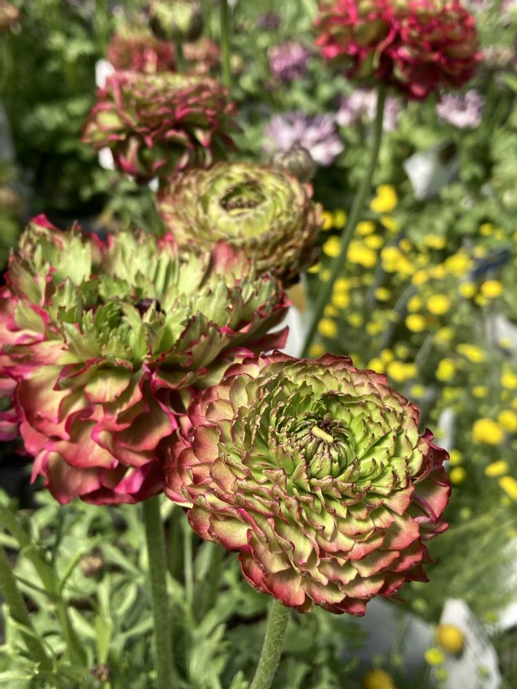 ポンポン咲きは、フリルのような花びらが幾重にも重なり、複色の一枚一枚の花びらが絶妙な色合いのラナンキュラスです🤭
