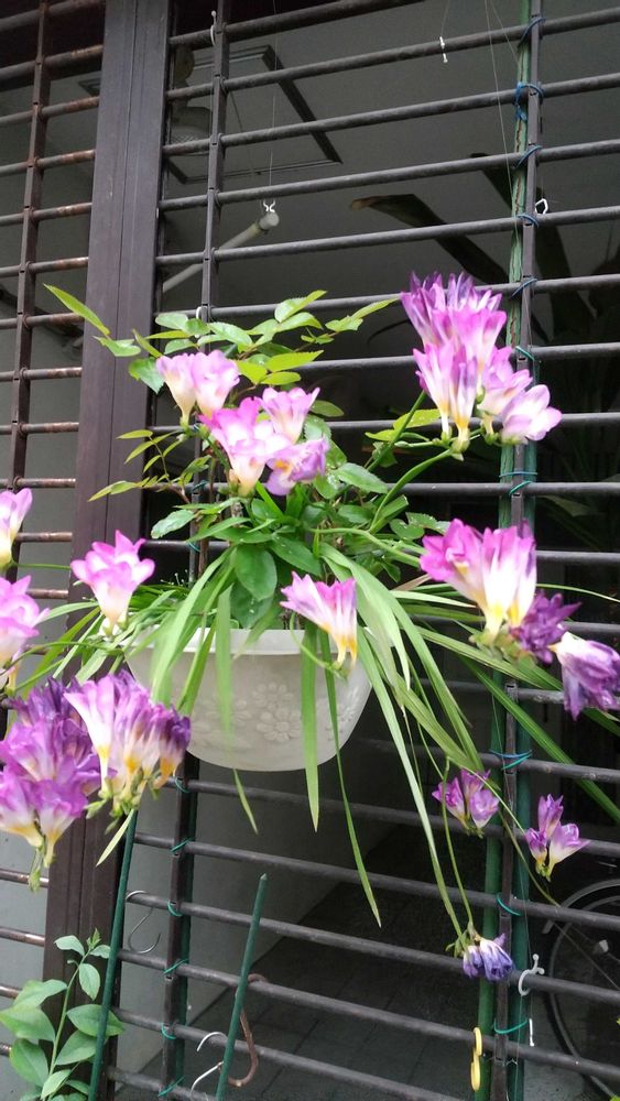 吊り下げのプランターに、紫色のフリージアの花が綺麗ですね。