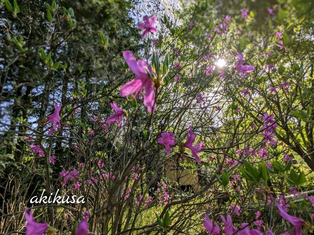 三つ葉ツツジをこの向きでは初めて写しました 向こうの下の方に小屋も小さく写っているんだけれど 見えないかな? 太陽は写真を見たら思いがけず写っていました〜 ラッキー!😅✌️💦