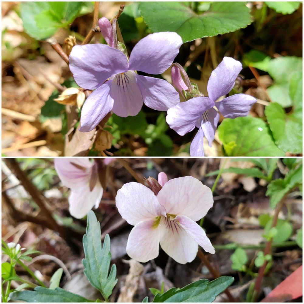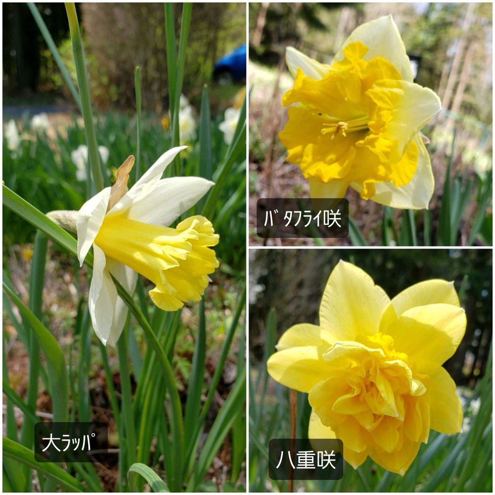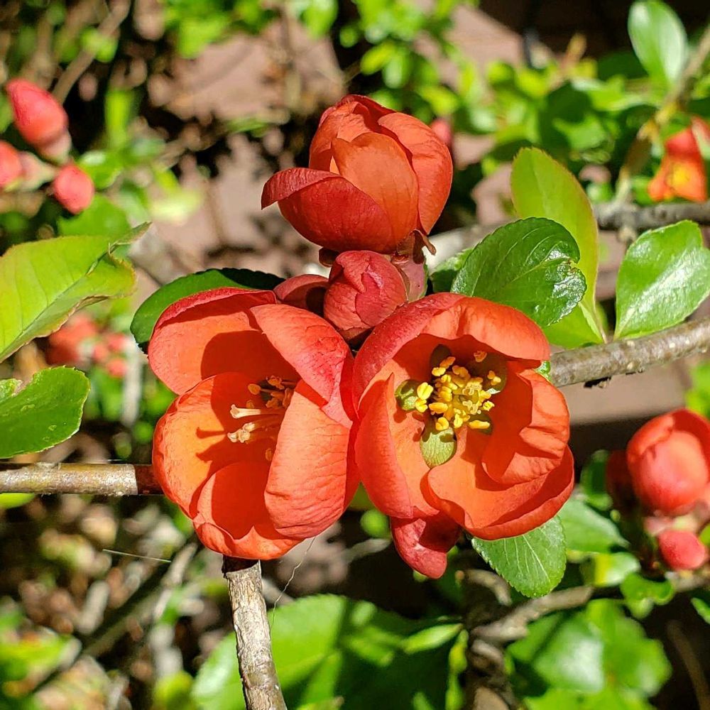 色んな顔のスイセンたちが賑やかになってきて、庭木のボケも咲いてきた。スミレたちは何故ここに??ってところで穏やかに咲いてる。