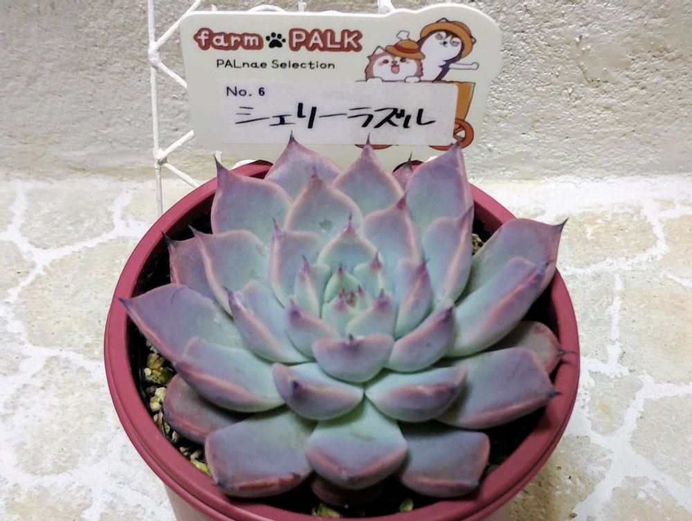 草姿草逢さんのブースはミックスベリアを始めとした有名どころの苗が販売されていたのですが、欲しかったミックスベリア(白玉美尼、マスカットキャンディ、華切子)とキョータさんの苗「ちくさ餅」が買えず、唯一購入できたのはシェリーラズルでした