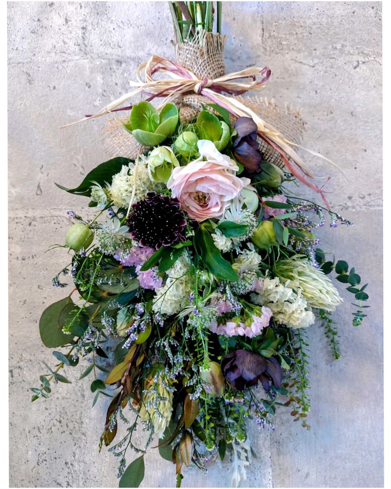 クリスマスローズ、ラナンキュラス、スカピオサ、スターチス、ユーカリ等全部で18種類の花材を使ったスワッグです💞