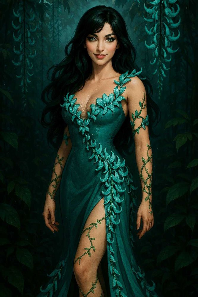 ヒスイカズラをモチーフにしたセクシーなワンピースドレスの美女を描くために、以下のようなビジュアルイメージで仕上げようと思います: