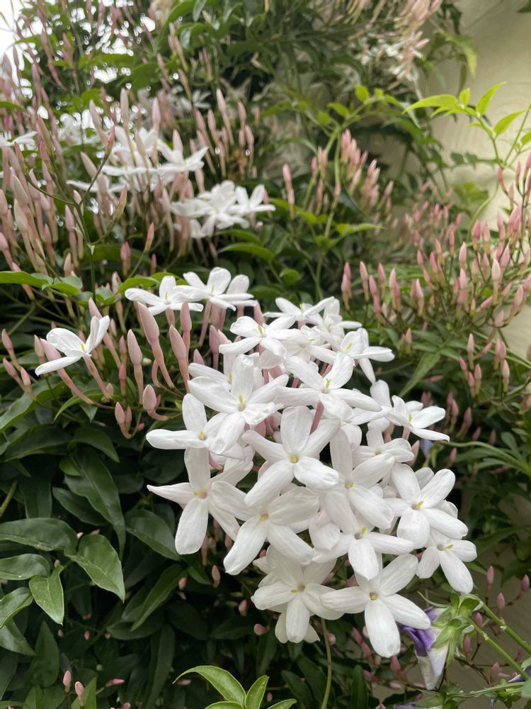 ①昨年殆ど剪定してしまった羽衣ジャスミンが咲き始めました。