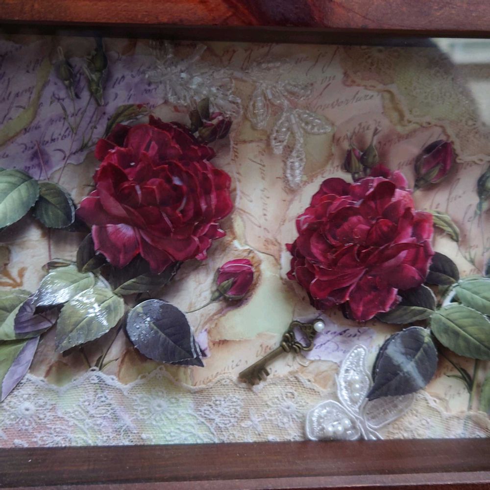 シャドーBoxの薔薇はなんと紙なんです〜何枚も重ねて、ニス塗って繰り返して作るの〜🌹