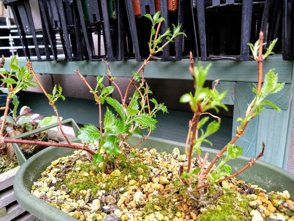 ②コアジサイの新葉と