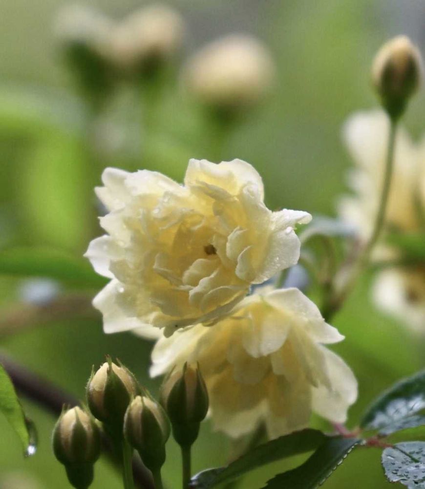 優しいお色のモッコウバラの上に春雨の素敵な雨粒ですね!