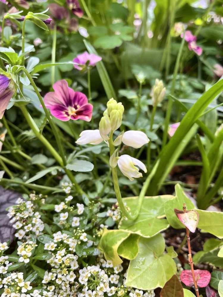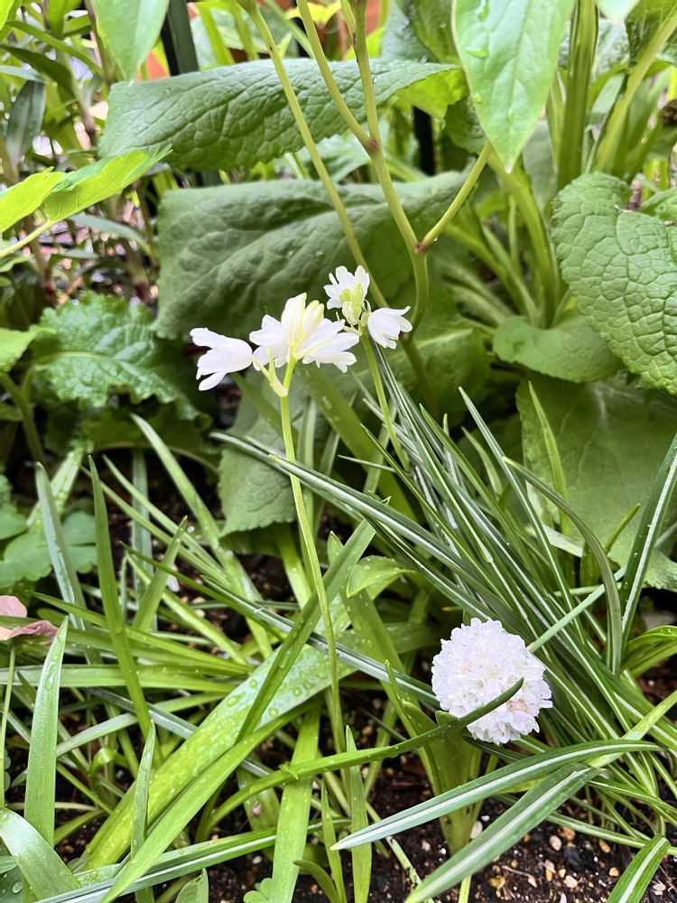 1,2枚目、球根つりがね草。ピンク、うす紫も咲く予定なので、楽しみです😊2枚目の右下の丸いお花はアルメリアです❣️