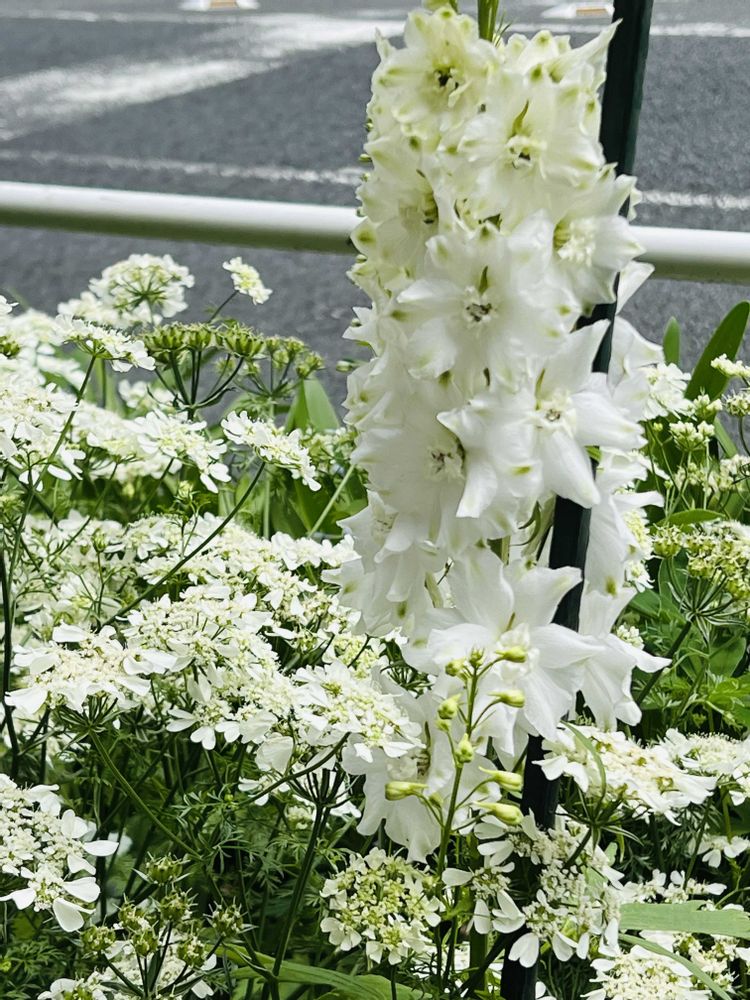 華やかなノッポさんのデルフィニウムとオルレアの花の競演💙🤍💜