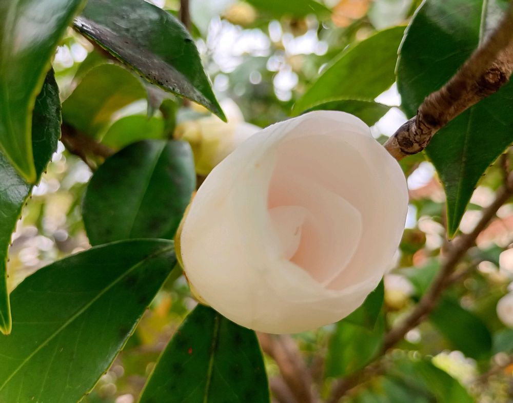 ころんと🥚🤍タマゴのような咲き始めの白椿💮。 また📍楽しみなポイントになりました🥰