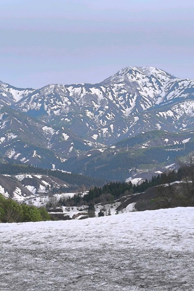 残雪の白、桜のピンク、新緑の緑のコントラストが美しい雪国「魚沼」ならではの絶景の1つ。