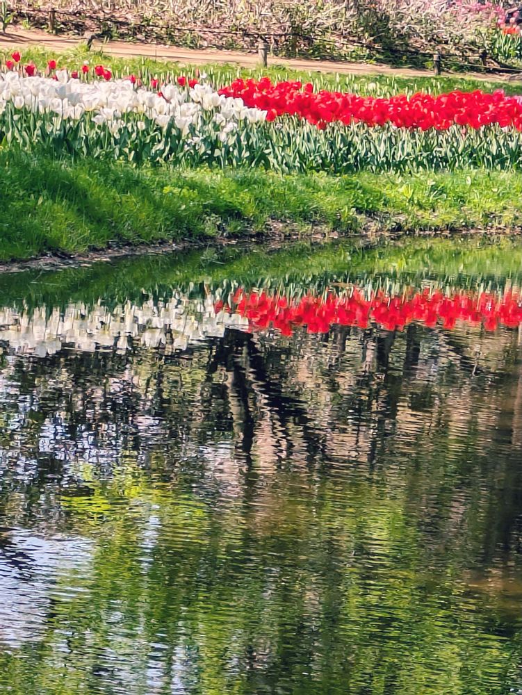 水辺に写るチューリップと新緑のシルエットもタイムリー◝(⁰▿⁰)◜