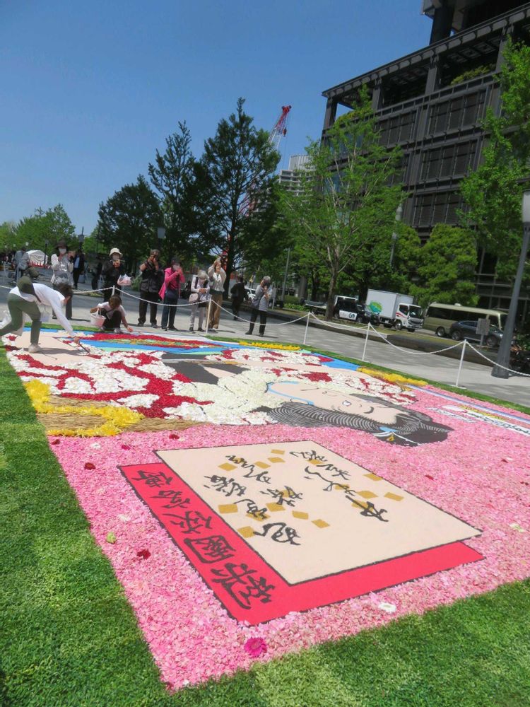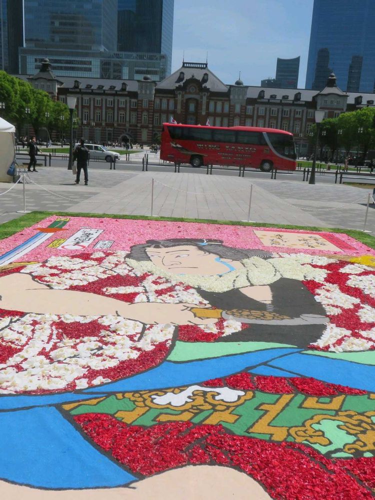 50,000本の花で描かれた巨大な歌舞伎絵が道行く人の目を楽しませていました😊
