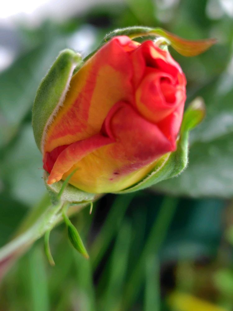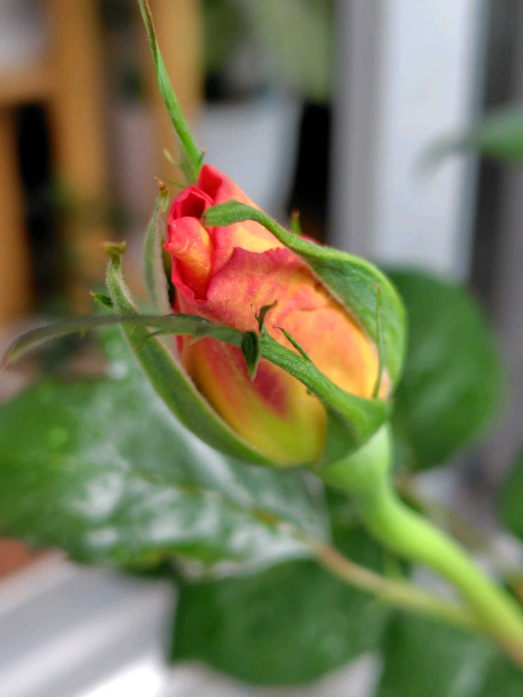 家で一番早いバラ・モニカが、やっと蕾が開きそうな状態です💮🌹💮