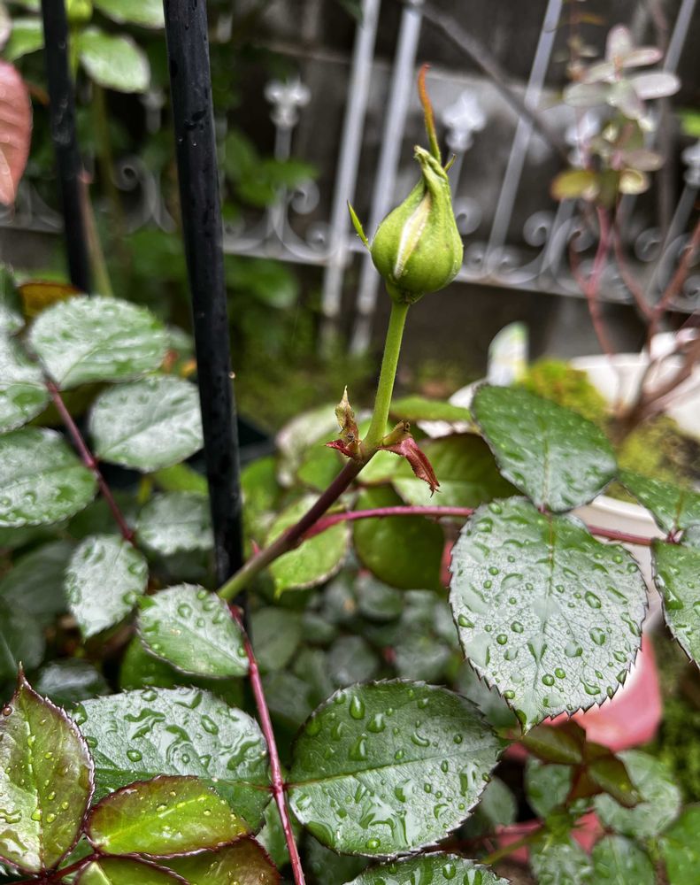 ④まだどのバラも蕾だけ。新入りリラの初めてのお花がこの子になりそう。すこぅし花弁が覗きました。