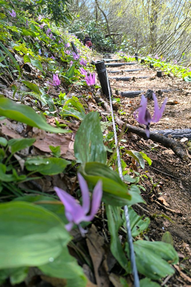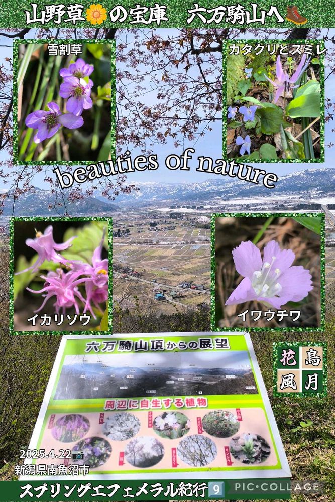 市内にはカタクリの群生が見られるスポットが数箇所あり、中でも六万騎山は一番早くカタクリに会える場所。標高321mの山全体が群生地となっており、一周約1時間のトレッキングコースで春の山野草を満喫できる。山頂からは上越国境の山々や魚沼盆地を一望でき眺めも抜群🔭👀