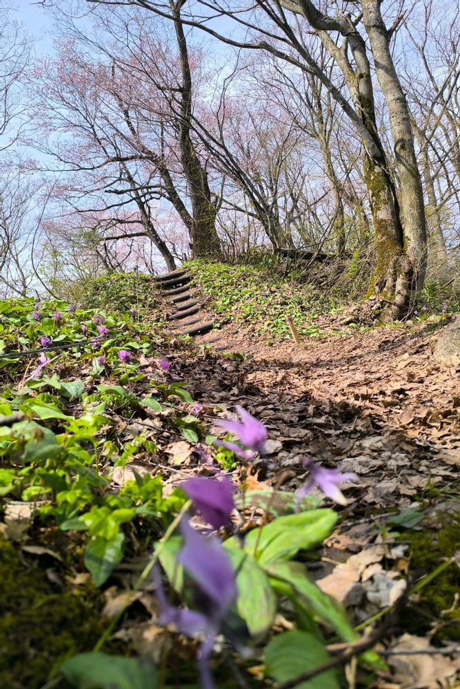 どちらのコースもカタクリは満開。ふれあいセンター側から登り始めたがこちらはスミレ、キクザキイチゲ、エンゴサク、ショウジョウバカマ、エンレイソウ、終わりかけの雪割草など。真浄寺口への下りはイワウチワとイカリソウがたくさん。