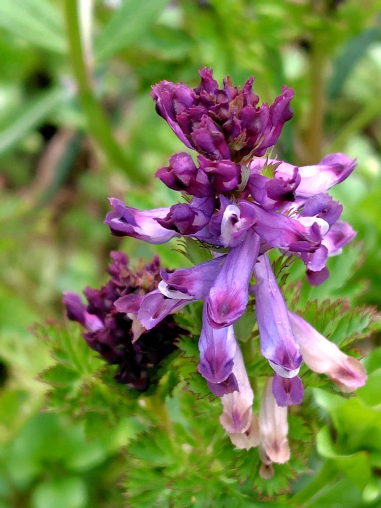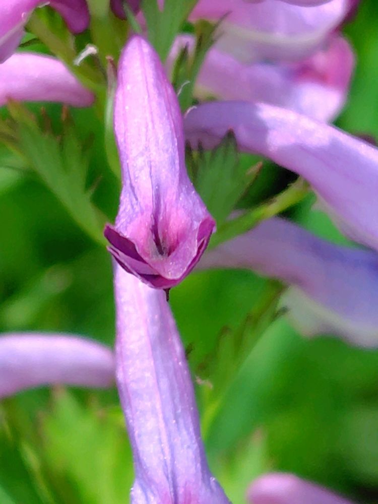 赤紫色の長さ2cmのキケマン属に独特の筒状の花を咲かせる。