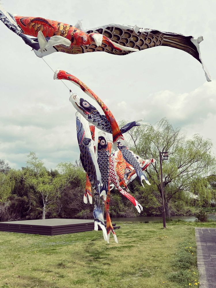新緑の柳、たんぽぽと共に鯉のぼりが風に乗って泳いでました‼️