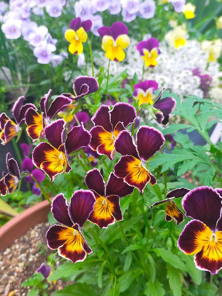 フレアブルー、黄&紫、紫の3種が育っています。紫は隠れてみえないけど。