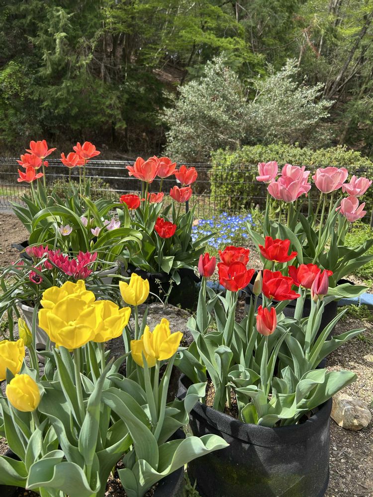 チューリップ勢揃い。あとは白だけが遅れてます。