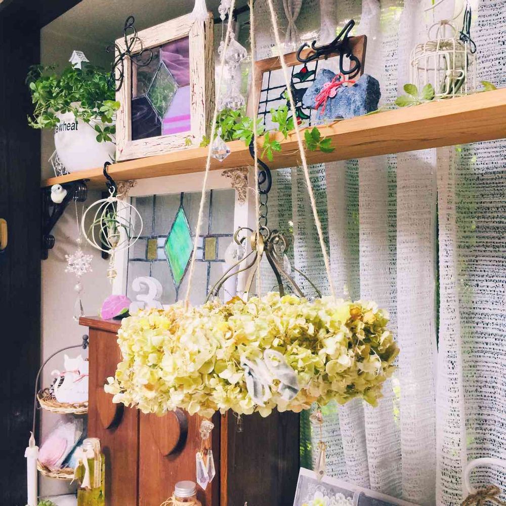 こんにちは!台風の雨風がすごくて寝不足です。フライングリースをアジサイのドライで作りました。