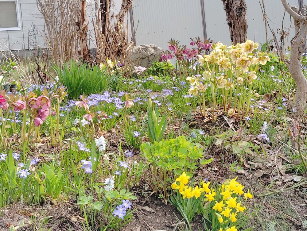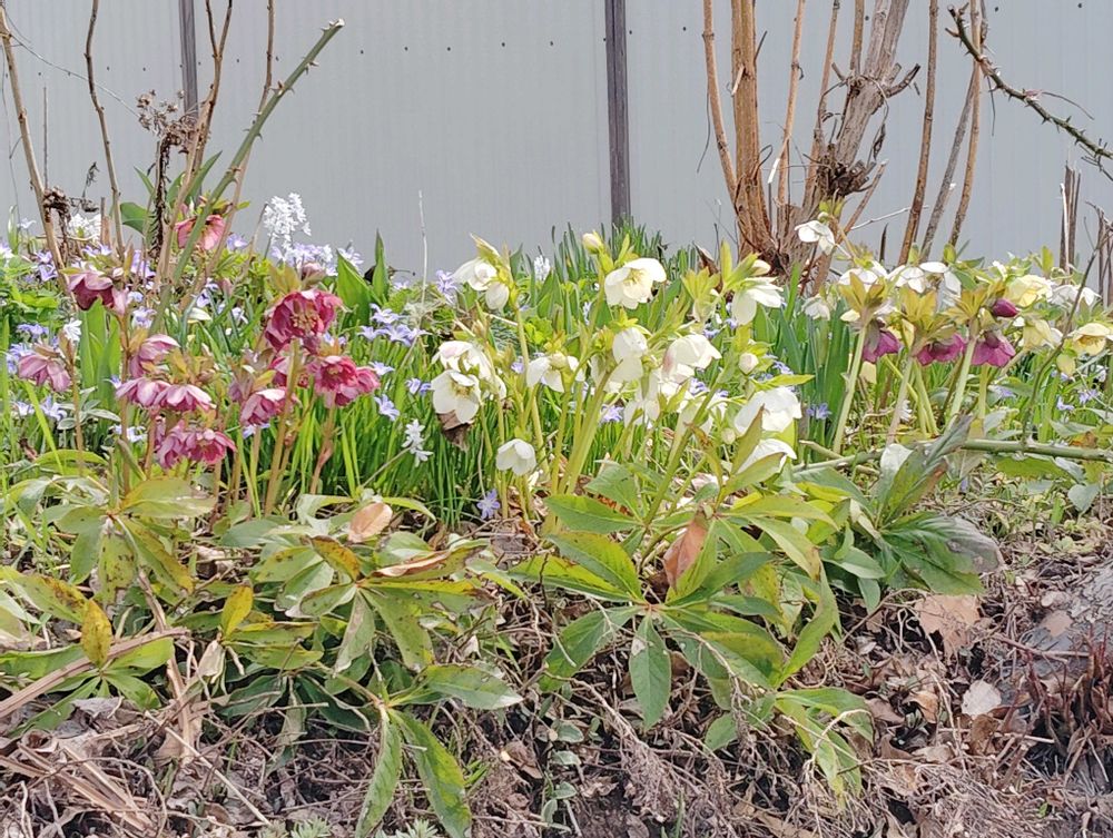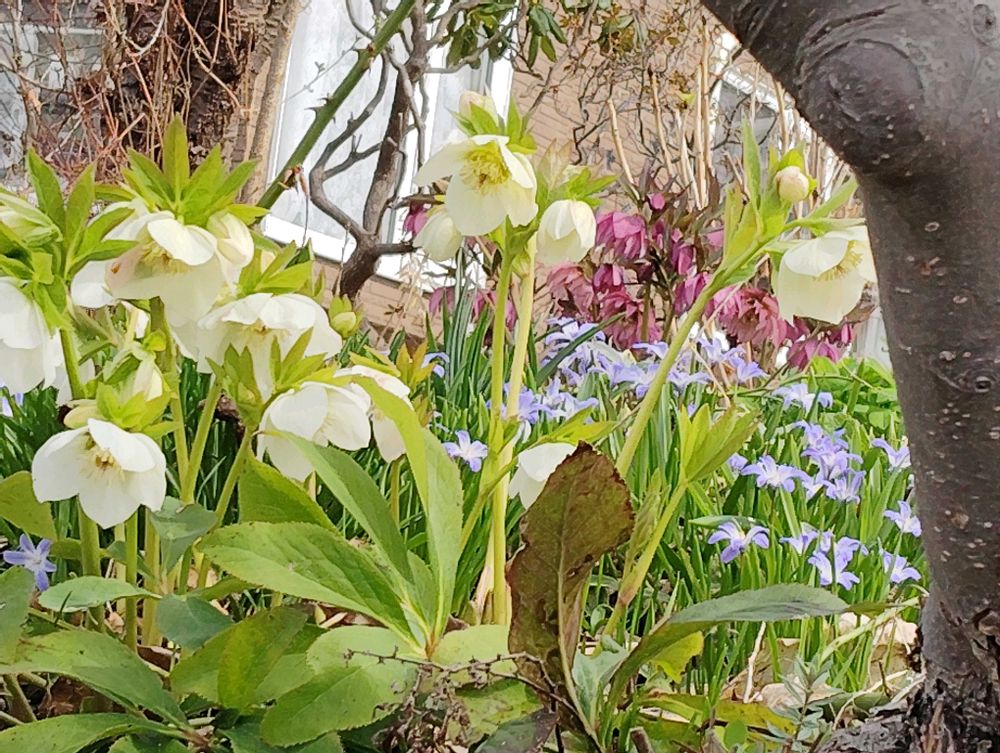 雪解け後早めに古い葉を切ったからかクリスマスローズの周りに沢山のチオノドクサが咲いてます