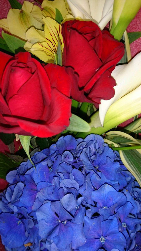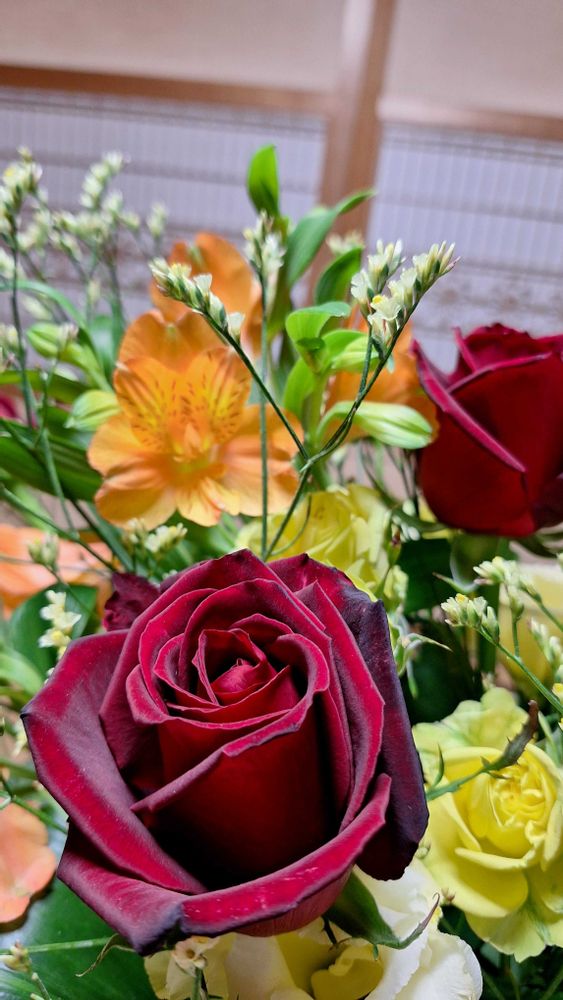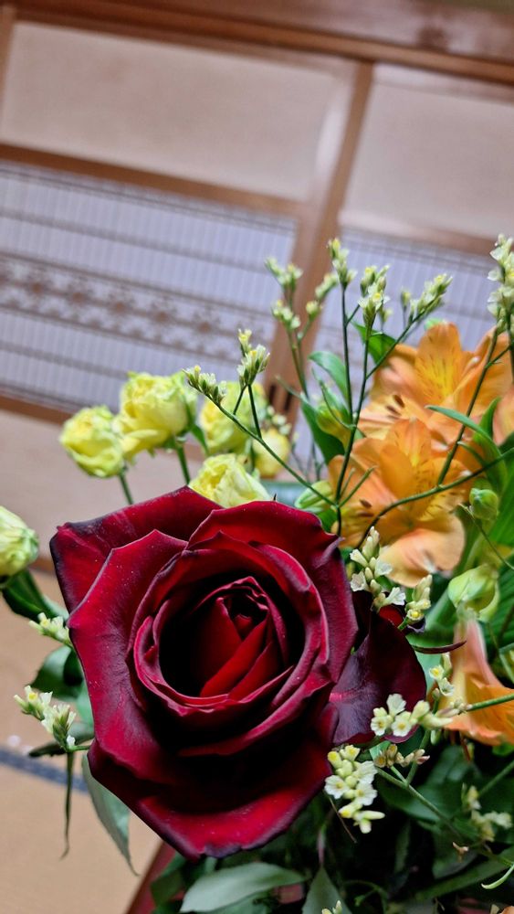 いただいた花束の中に真っ赤なバラ