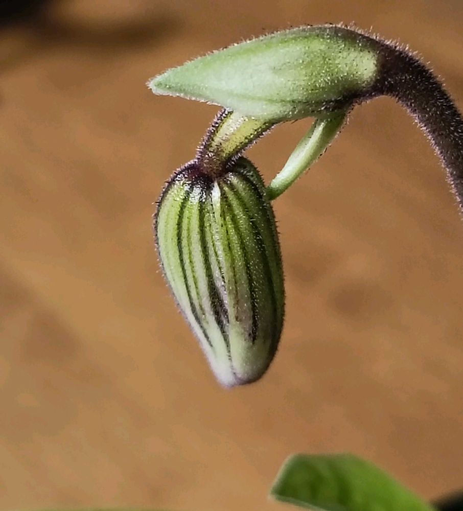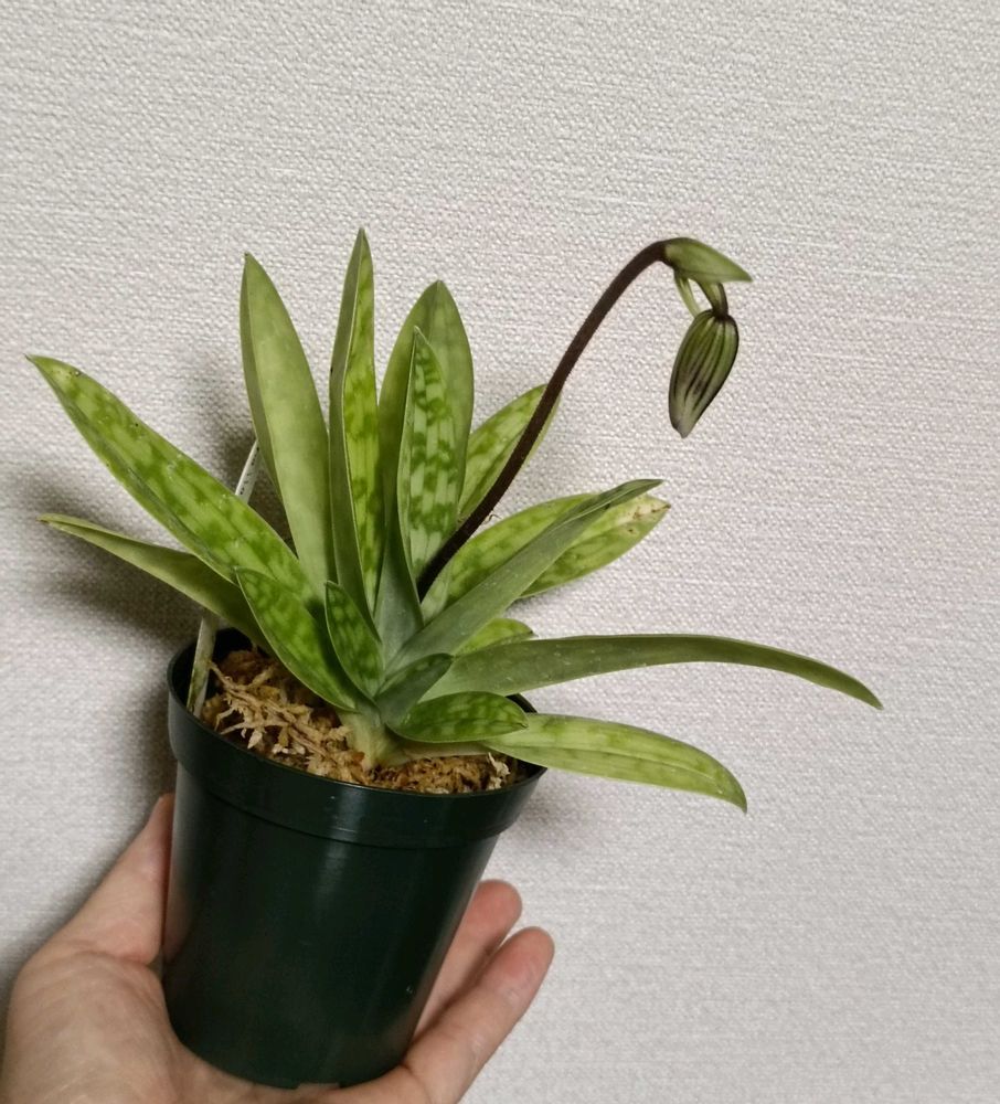 欲しいものリストに入ってる、デレナティのビニカラーには会えなかったけど、こんな可愛い手乗りパフィオに出会いました。蕾のパフィオは初めて。