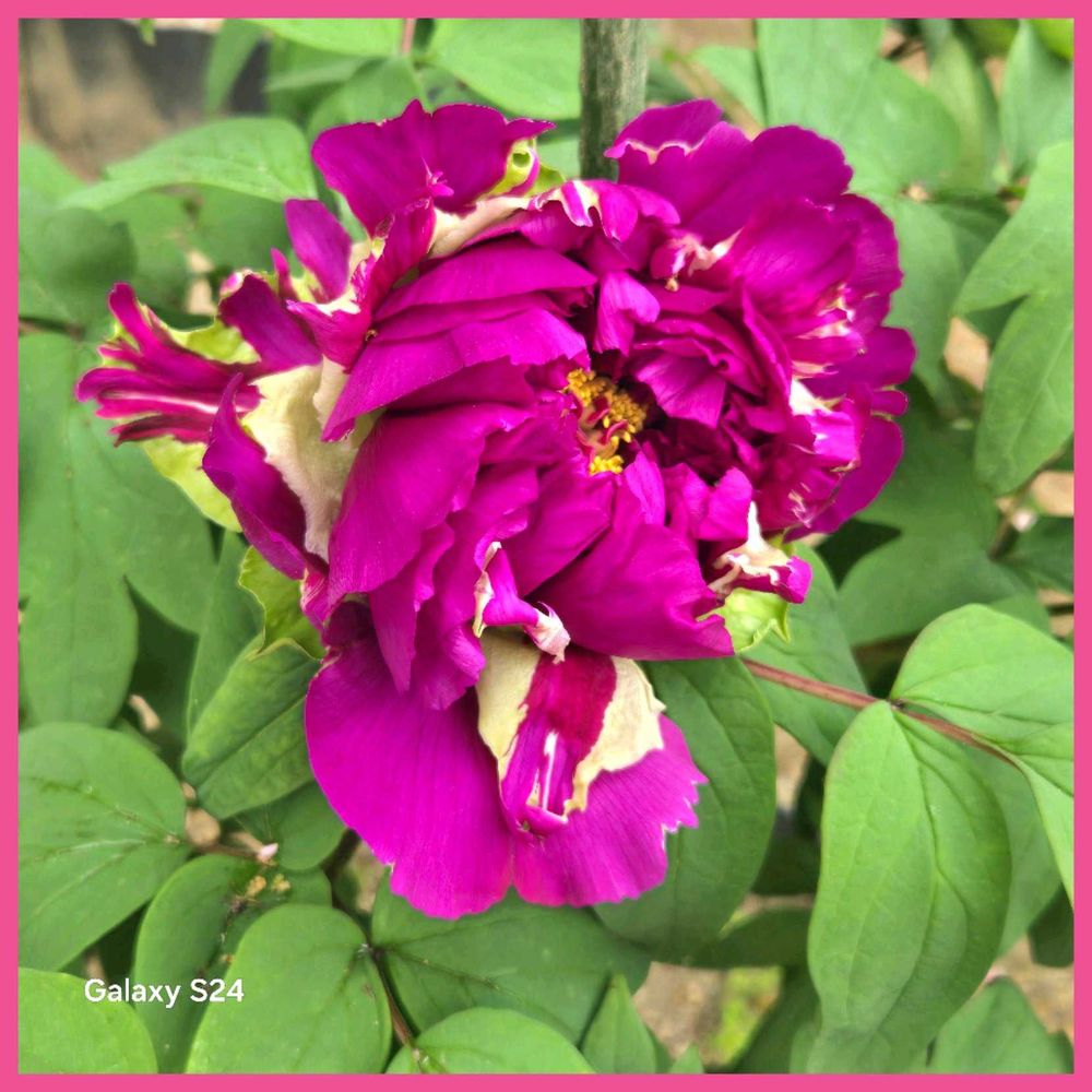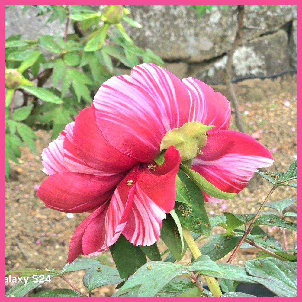 濃いピンクに少しのクリーム色の花びら、初めて見る牡丹です。