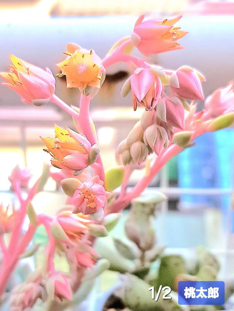 エケベリア花盛り30鉢くらい、これだけは外せないヒーロー🎶 桃色満開 1/2と2/2、