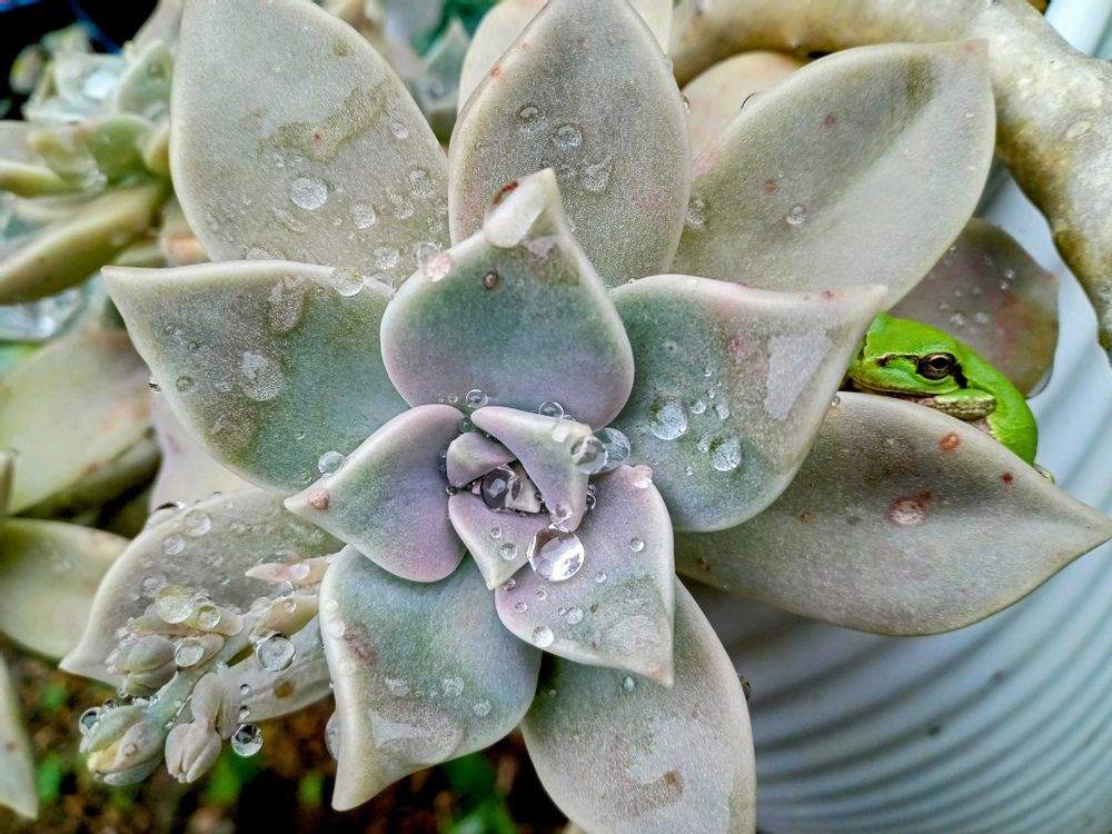 こちら、カエルの鳴き声はするんですがまだ見てないです。私も多肉に🐸乗ったら速攻撮るぞぉ💕