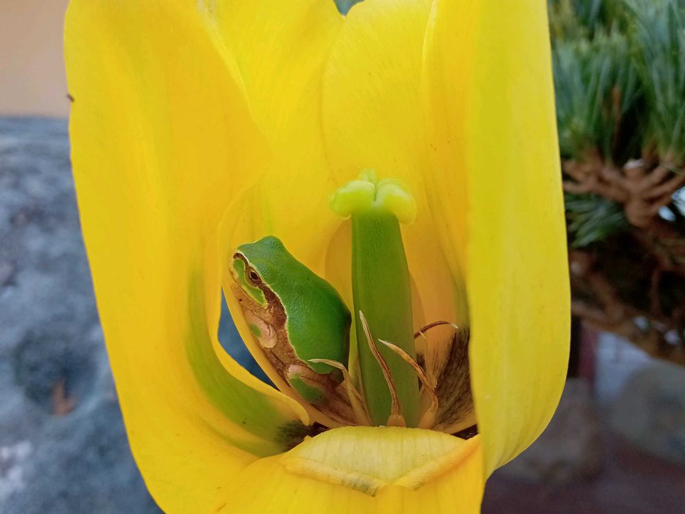 さん🐸✨めちゃんこカワユイよね🥰💓チューリップの中のカエルちゃんは昨日チューリップの花びらが落ちるまでしがみついてました(笑)