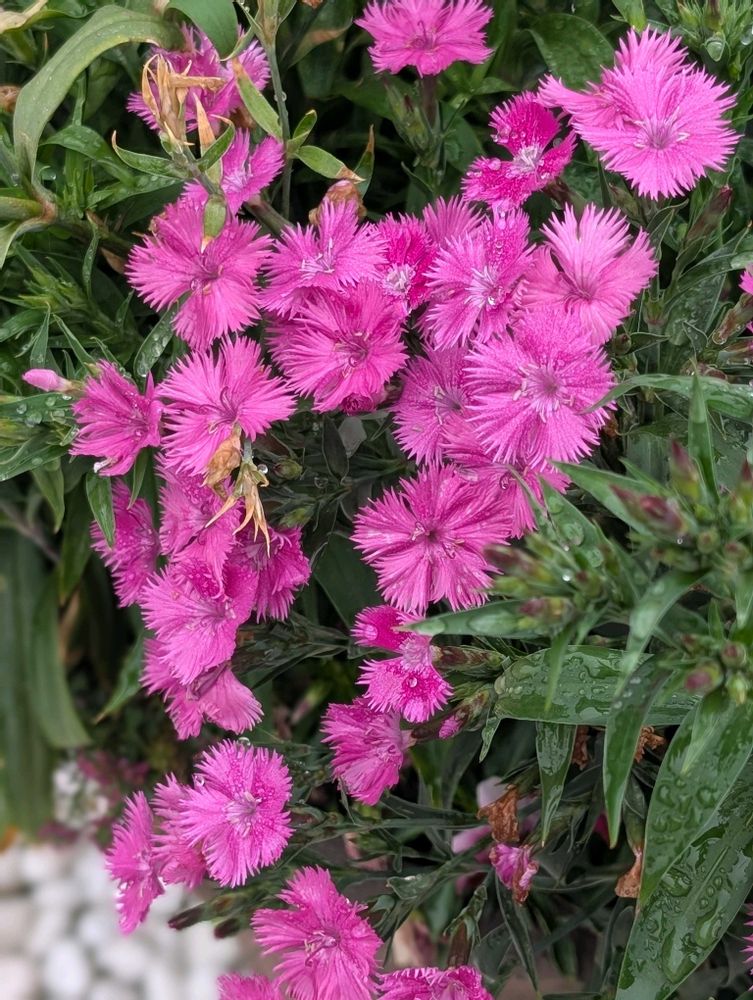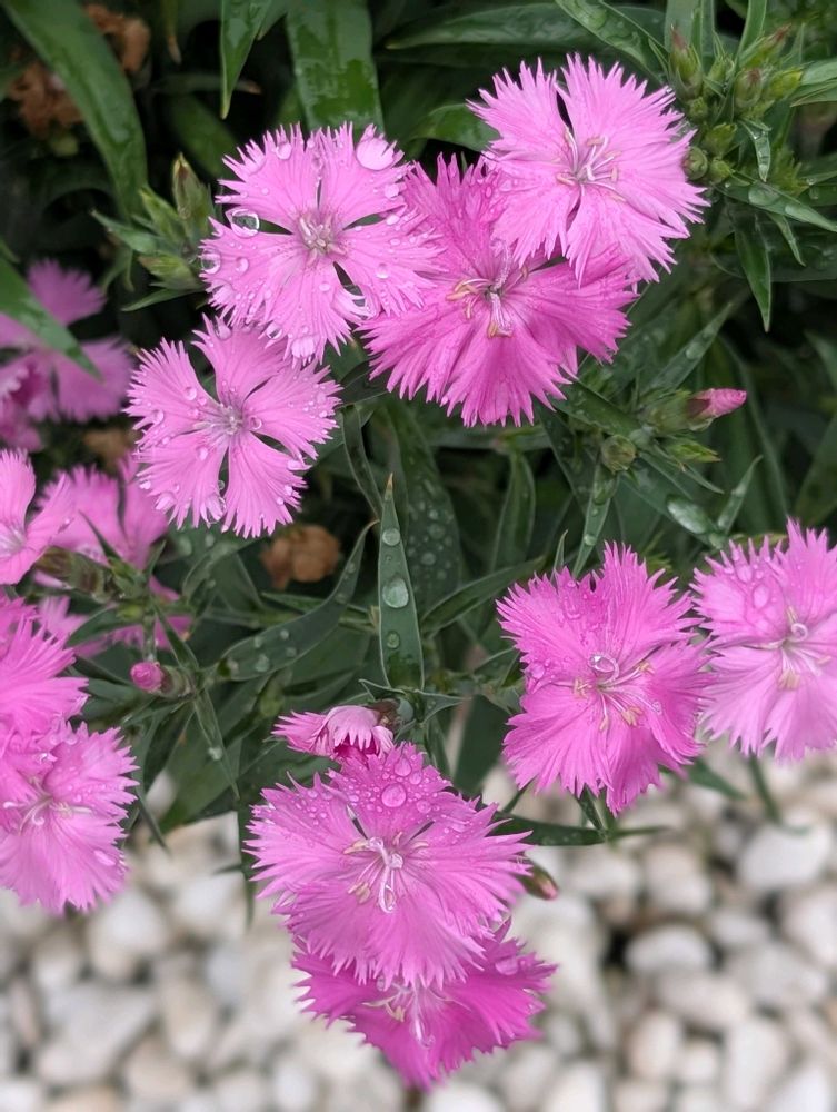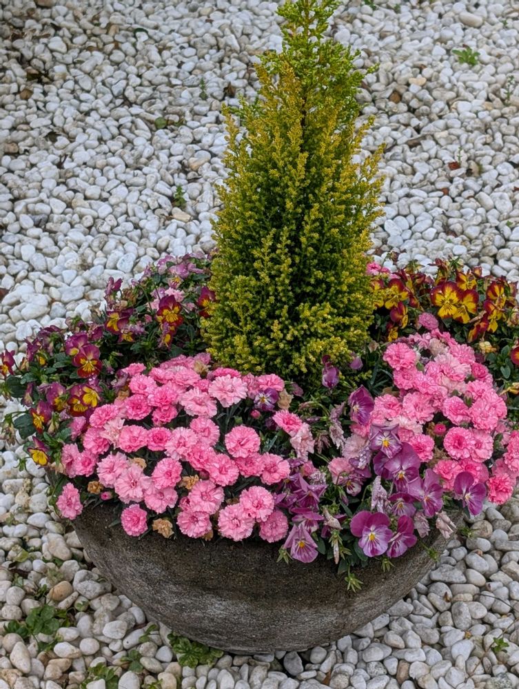 近所のクリニックの寄せ植えよりカーネーション、ナデシコ、そしてシラン