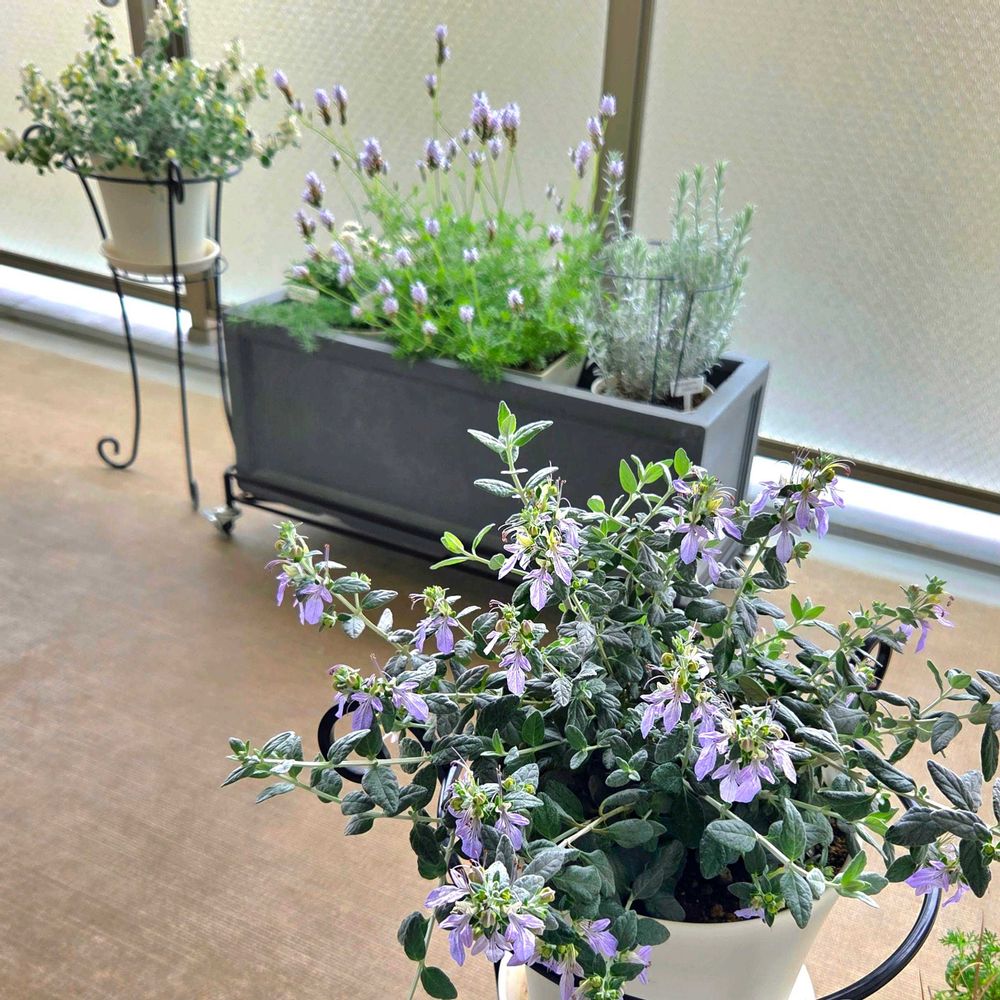 ルーフから避難中のツリージャーマンダーと。ラベンダーブルーのラベンターと色味が似ていて、ここに置いても合いそう