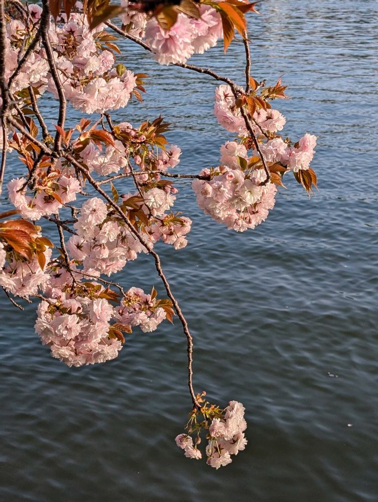 公園の大きな池ですね🌸水面と八重桜🌸素敵ですね🌸そらちゃん可愛い🐶💕