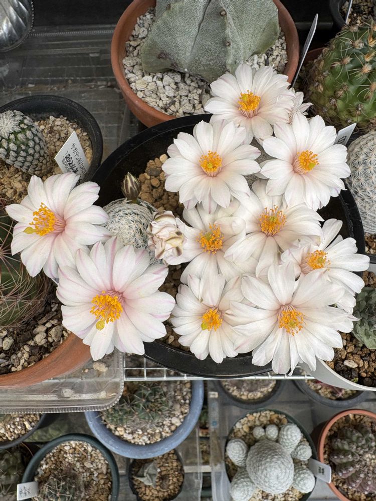 3株ほぼ同時です🌵それぞれの株に5輪、5輪、8輪の蕾からの群花です🌵