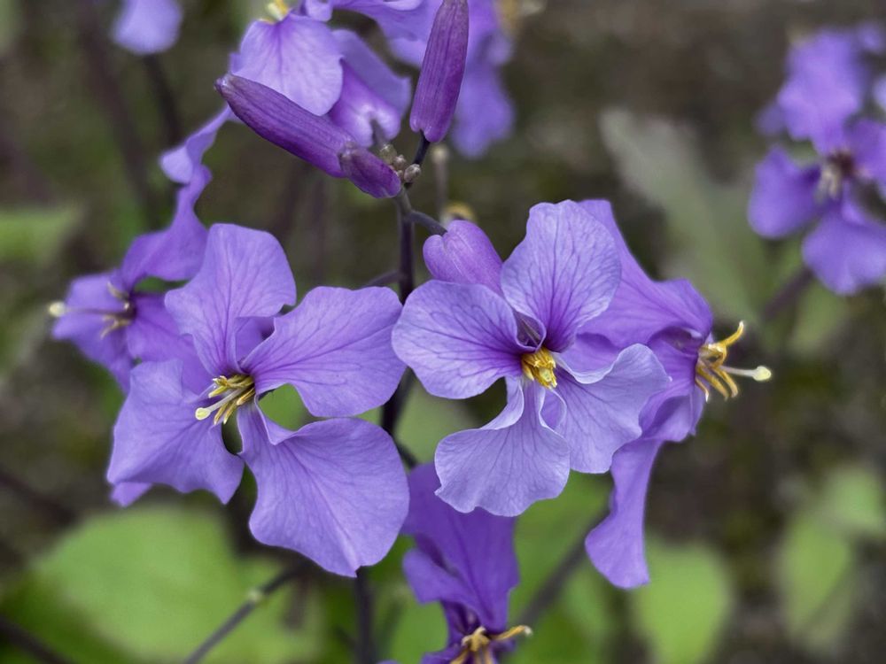 ③ムラサキハナナが満開。勝手に種を落とさないよう花柄摘みで管理しています。